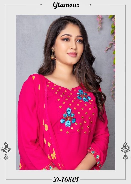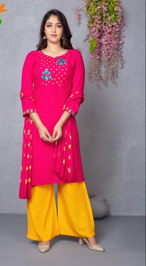Soft Rayon Single Coloured Kurti having Mirror embedded Embroidery Work on Front Yoke design, paired with contrast of plain colour Soft Rayon Palazzo and Nazmin Bandhani design Printed Dupatta