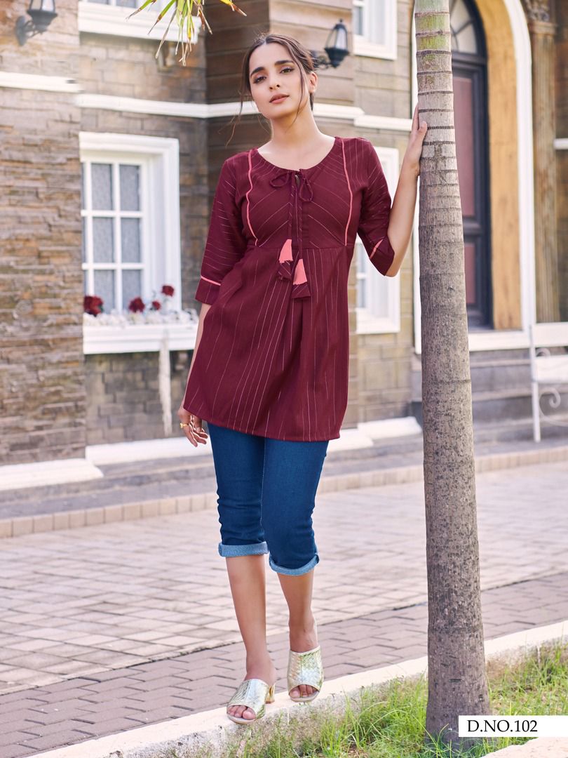Satisfy your cool aesthetic sense with our hot selling, soft comfortable lurex rayon slub fabric classic top; having three quarter sleeves, round neck design with tassles / buttons, single coloured with fabric cut patterns, to match your style and add to your wardrobe essentials.