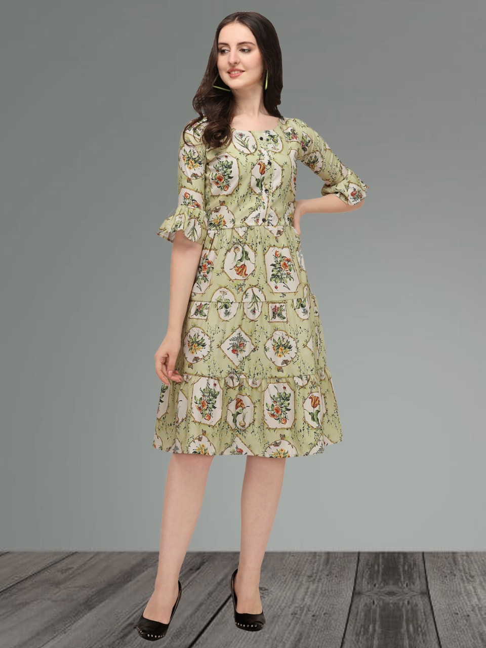 This tiered frock dress comes in deep bright colour with floral/abstract and splash mix coloured print having round neck, three forth sleeves flare-ended. The dress is made of Jaipuri cotton fabric, with inner lining on the top bodice, for your extra comfort; and is with a wide flare silhoutte