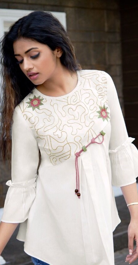 Look Gorgeous with trendy soft heavy rayon fabric Tunics with embroidery / longline button / tassels / button detailing to match your style, three quarter sleeves with flared or designed cross stitches for appeal